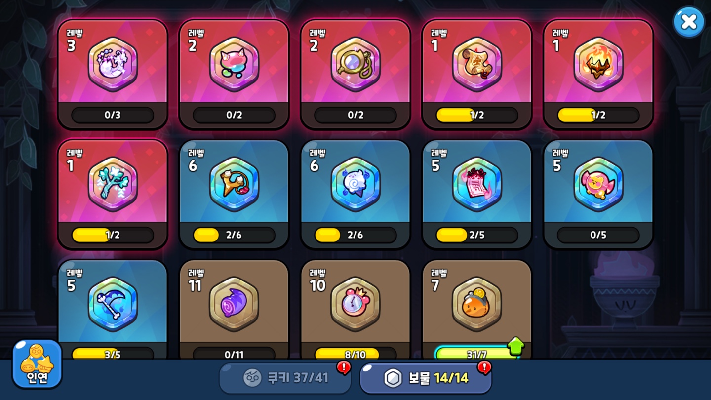 일단 에소나 닼초처럼 스토리 모드, 아레나, 길드전에서 사용하는 쿠키들 레벨을 먼저 올려주고 있습니다.